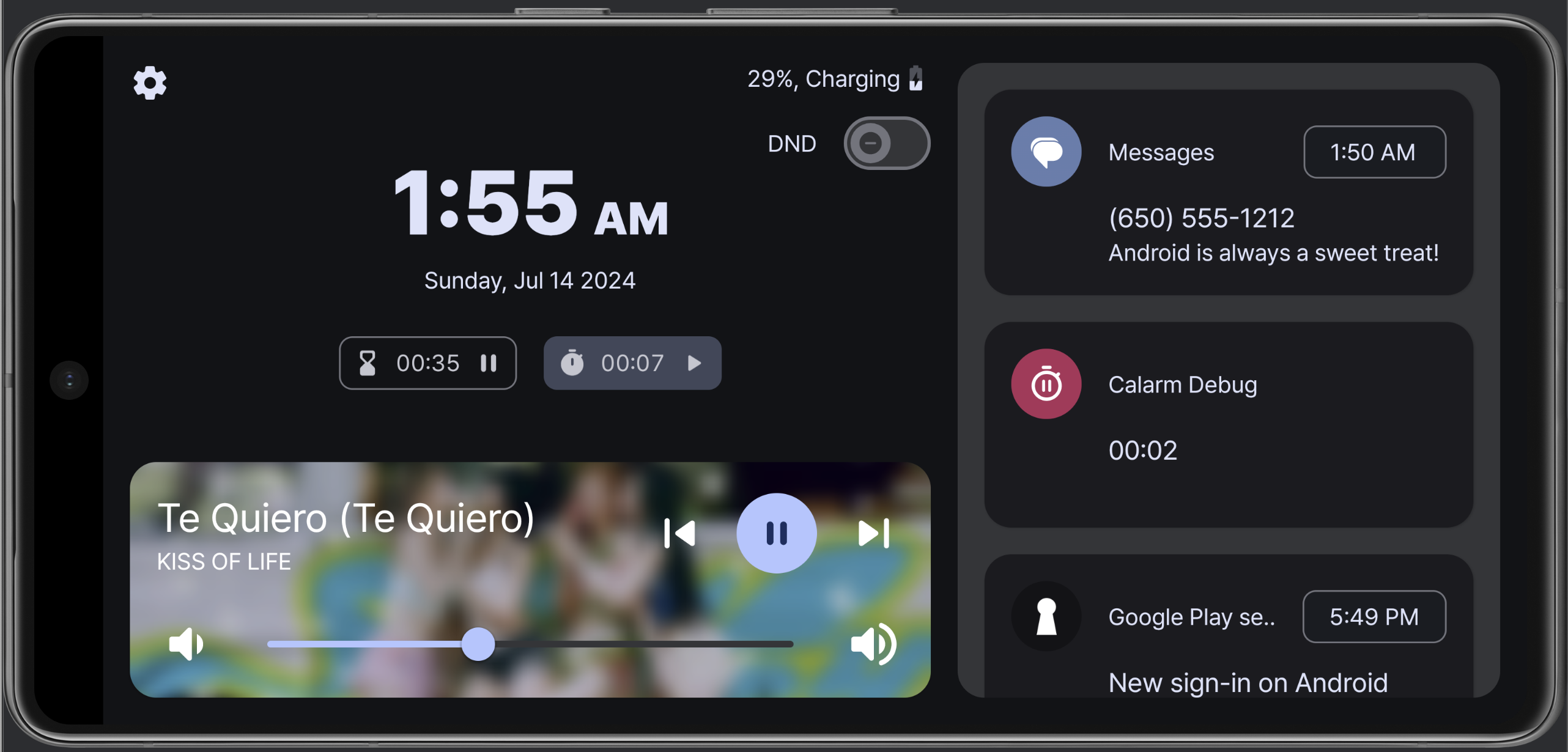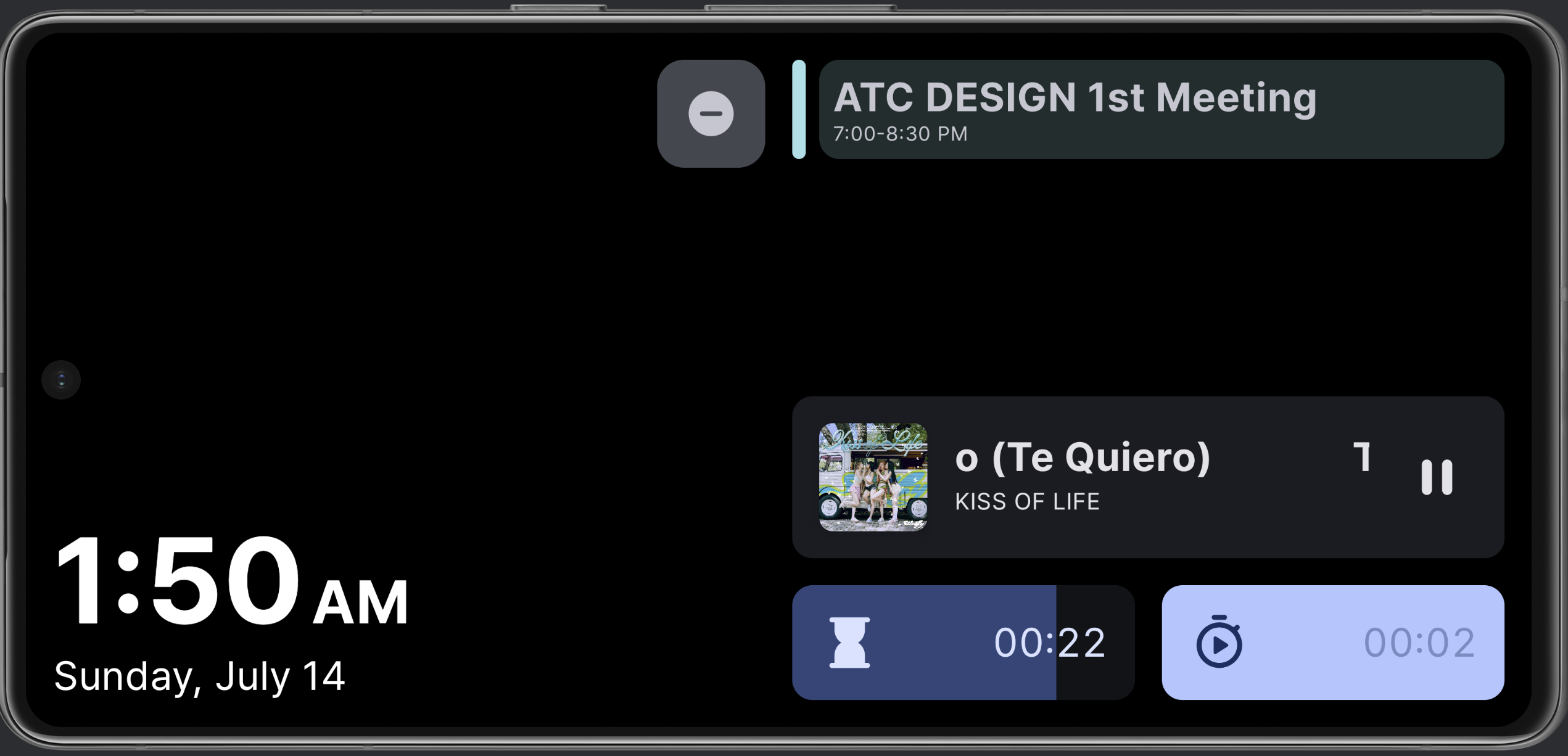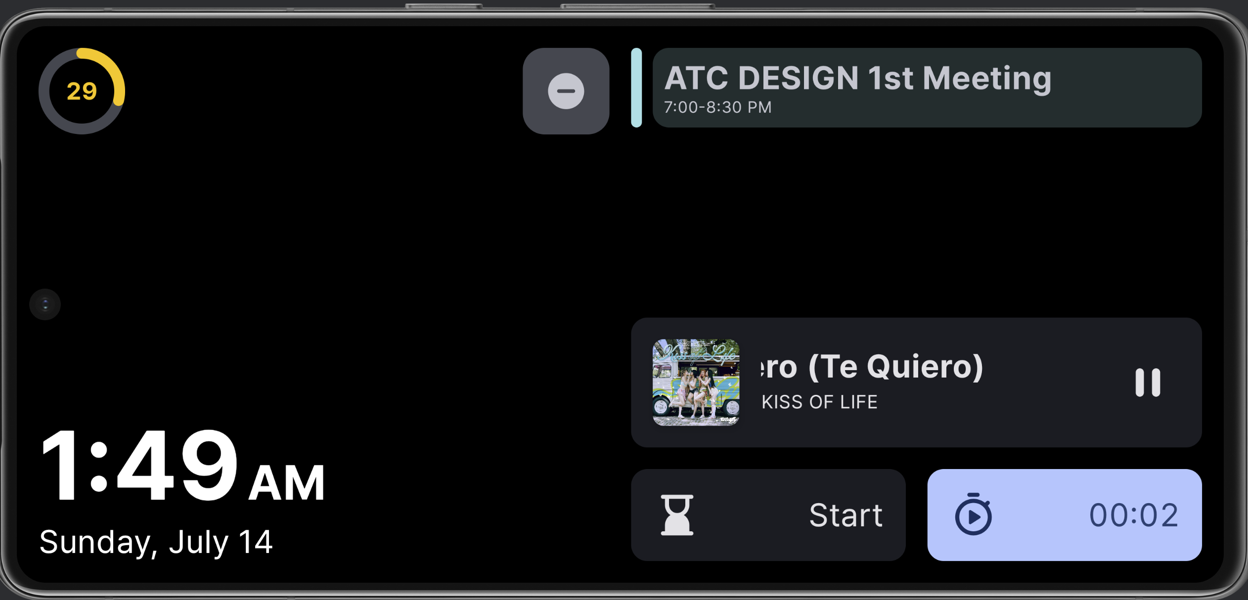탁상시계는 그냥 새롭게 엎었다. 디자인은 애플의 Standby를 참조했다. 사실 얘는 세로용은 아니지만, 세로용 디자인도 나름 신경을 썼다. 가장 큰 차이는 알림을 항상 보여주지 않는 것. 생각해보니 모든 알림을 보여줄 필요가 있을까? 이제는 올 때만 뜬다. 그리고 이전에는 음악을 미디어 알림에서 직접 가져왔는데, 세션을 통해서 미디어 play info를 가져오는 방법이 있더라. 그래서 앨범아트도 고화질로 들고올 수 있었고, Spotify Connect 등 디바이스에서 직접 재생되지 않는 애들도 재생 정보를 잘 가져올 수 있었다.