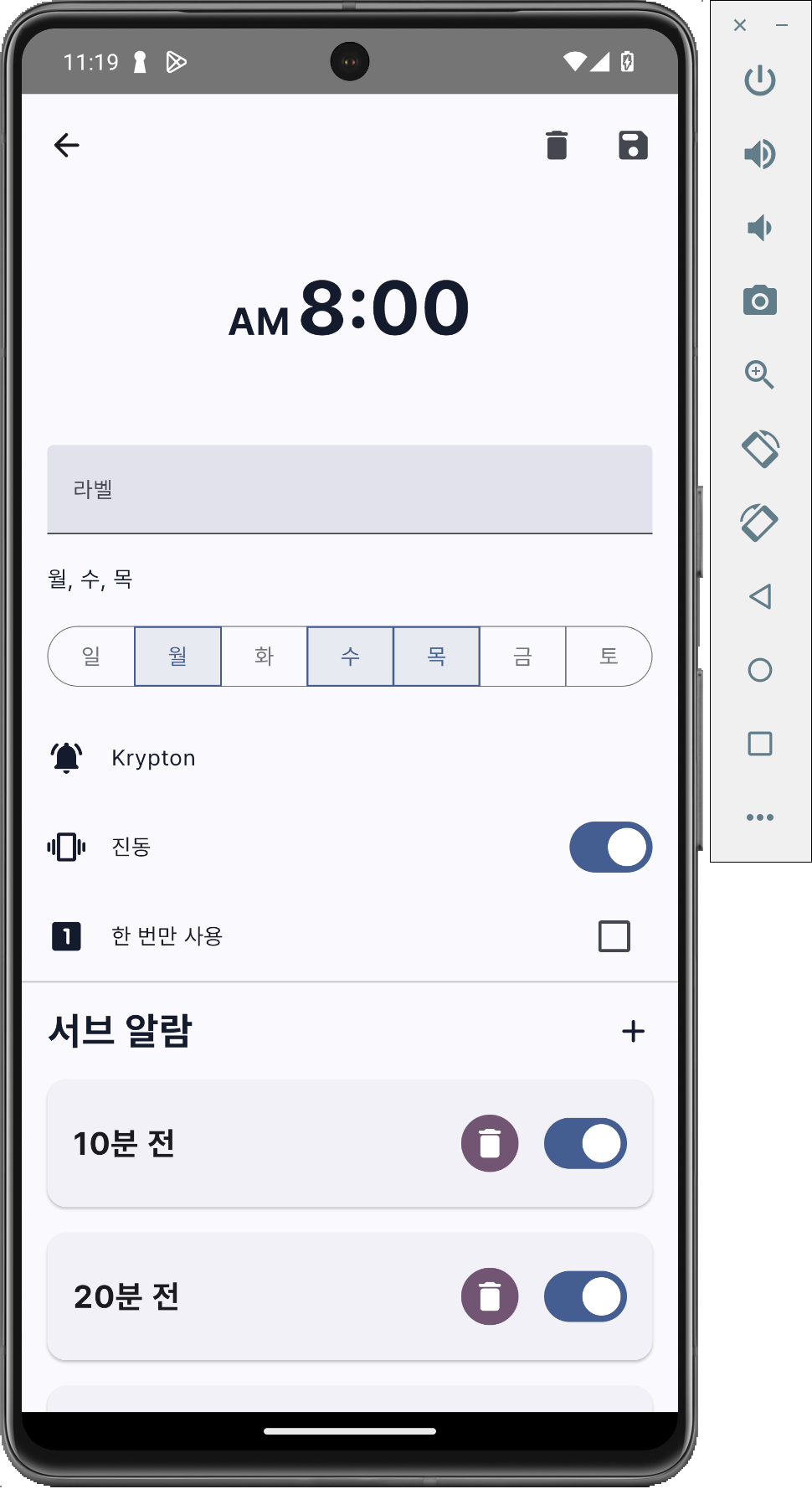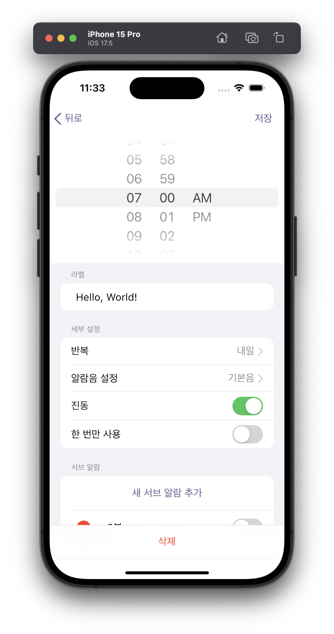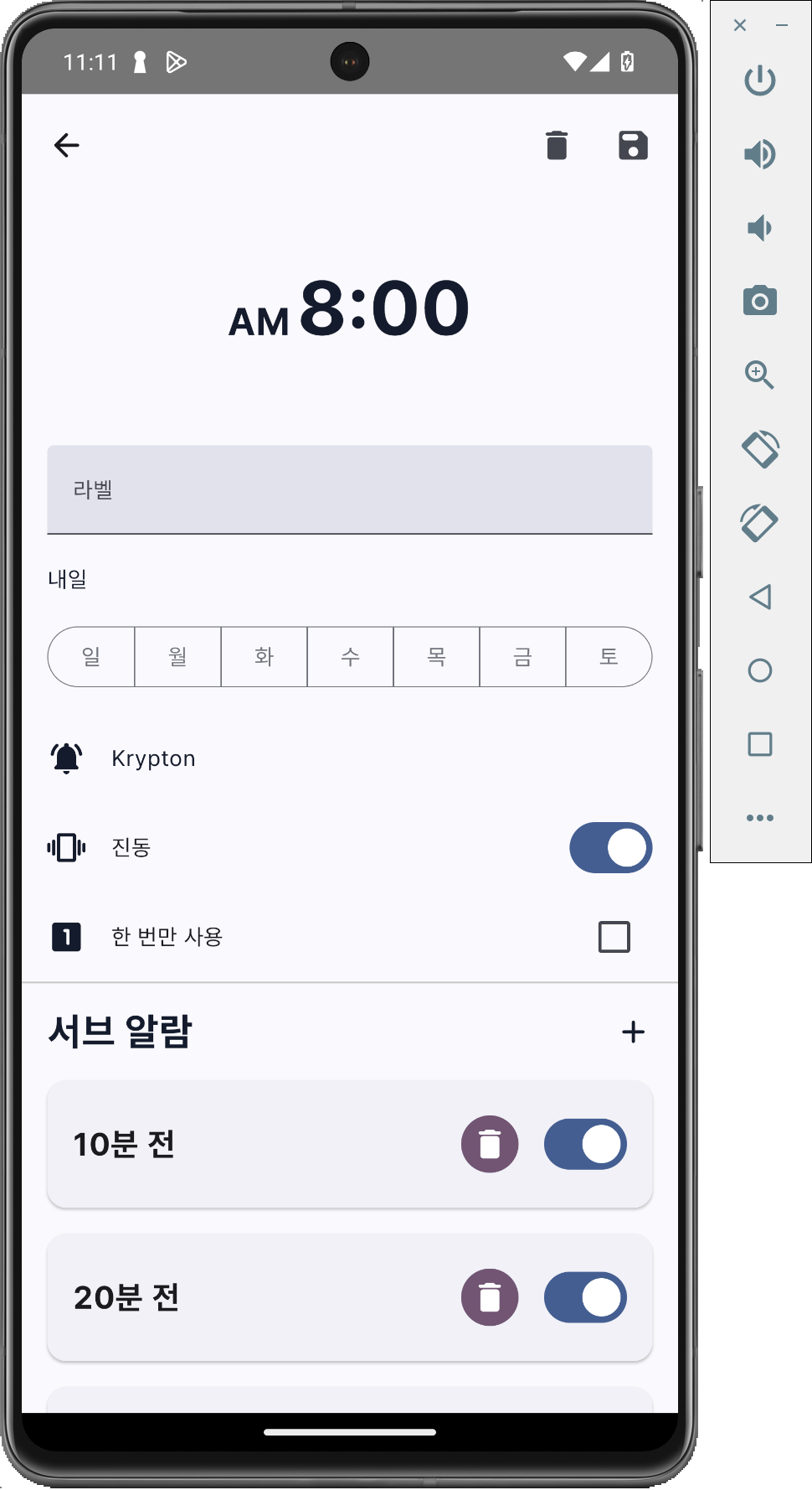 서브 알람 추가 화면