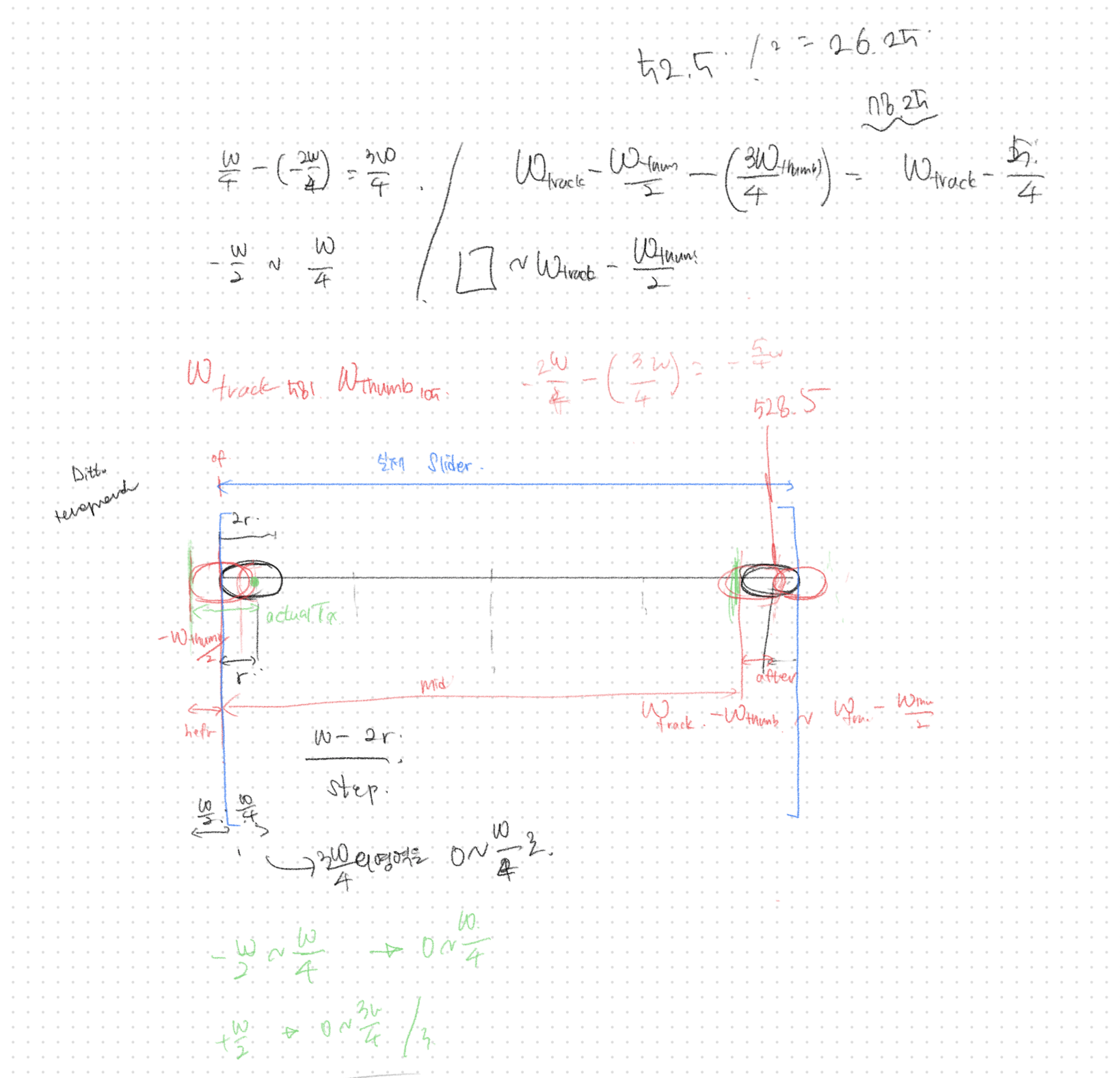 iPad에 적어두고 계산해가며 슬라이더 초반 부분을 iOS처럼 구현하고자 했다. 기존 Backdrop의 라이브러리는 그냥 저 영역 안쪽이면 coerceAt 사용해서 최댓값 최솟값을 지정해버렸는데 그렇게 하니까 Step 구현할 때 영 이상해져서 그냥 저 부분을 배속하는 것으로 바꾸었다.