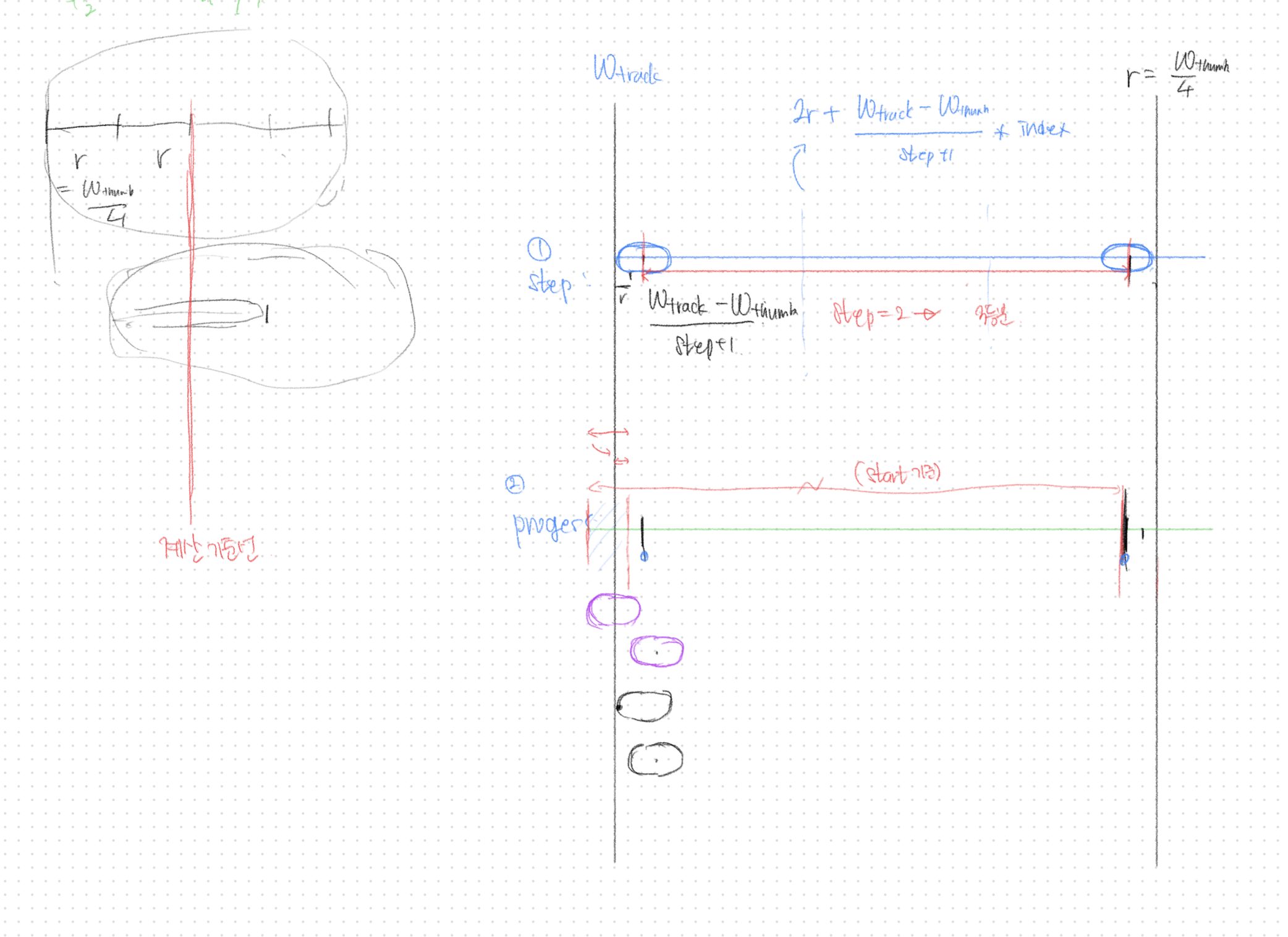 iPad에 적어두고 계산해가며 슬라이더 초반 부분을 iOS처럼 구현하고자 했다. 기존 Backdrop의 라이브러리는 그냥 저 영역 안쪽이면 coerceAt 사용해서 최댓값 최솟값을 지정해버렸는데 그렇게 하니까 Step 구현할 때 영 이상해져서 그냥 저 부분을 배속하는 것으로 바꾸었다.
