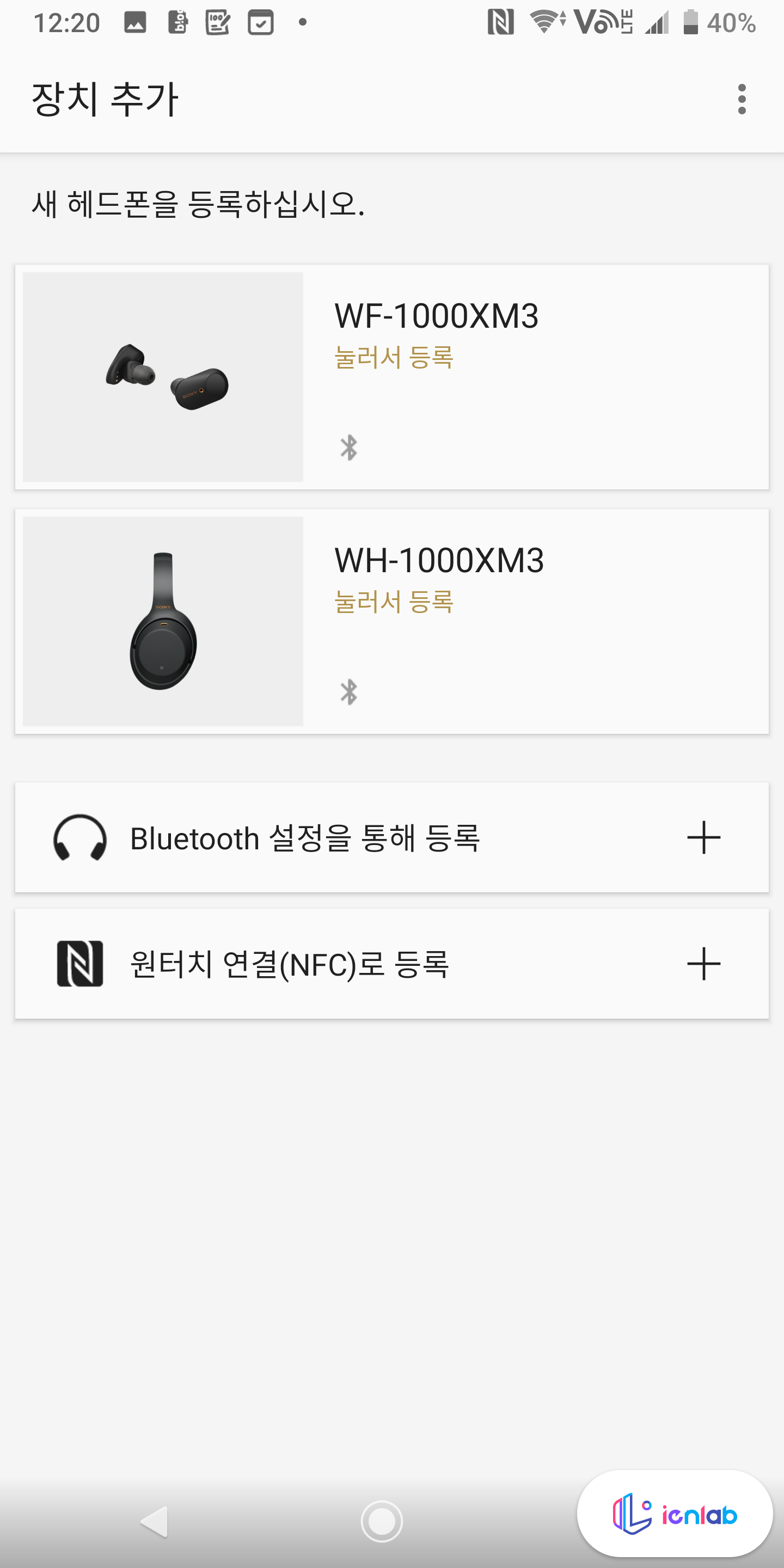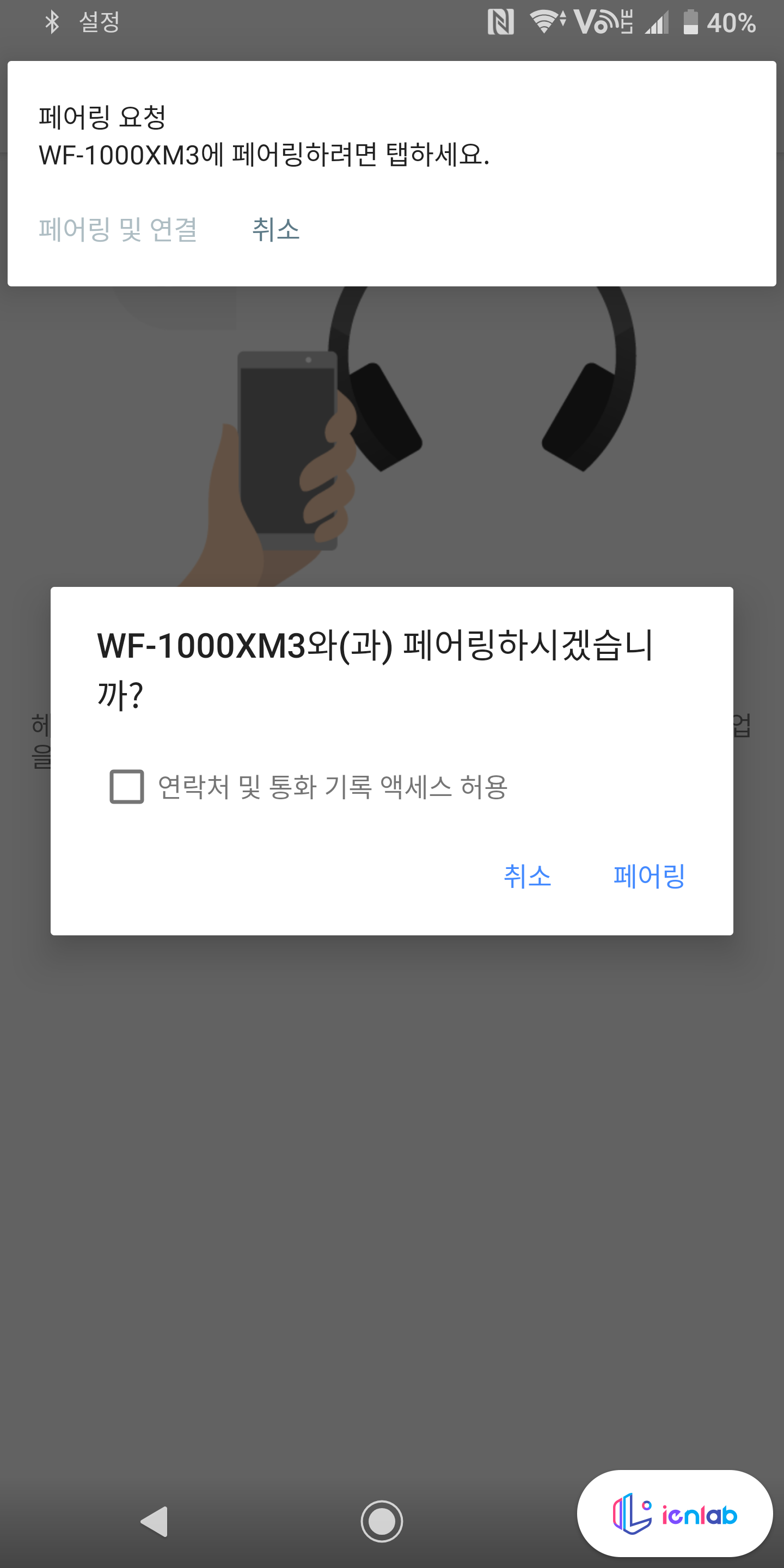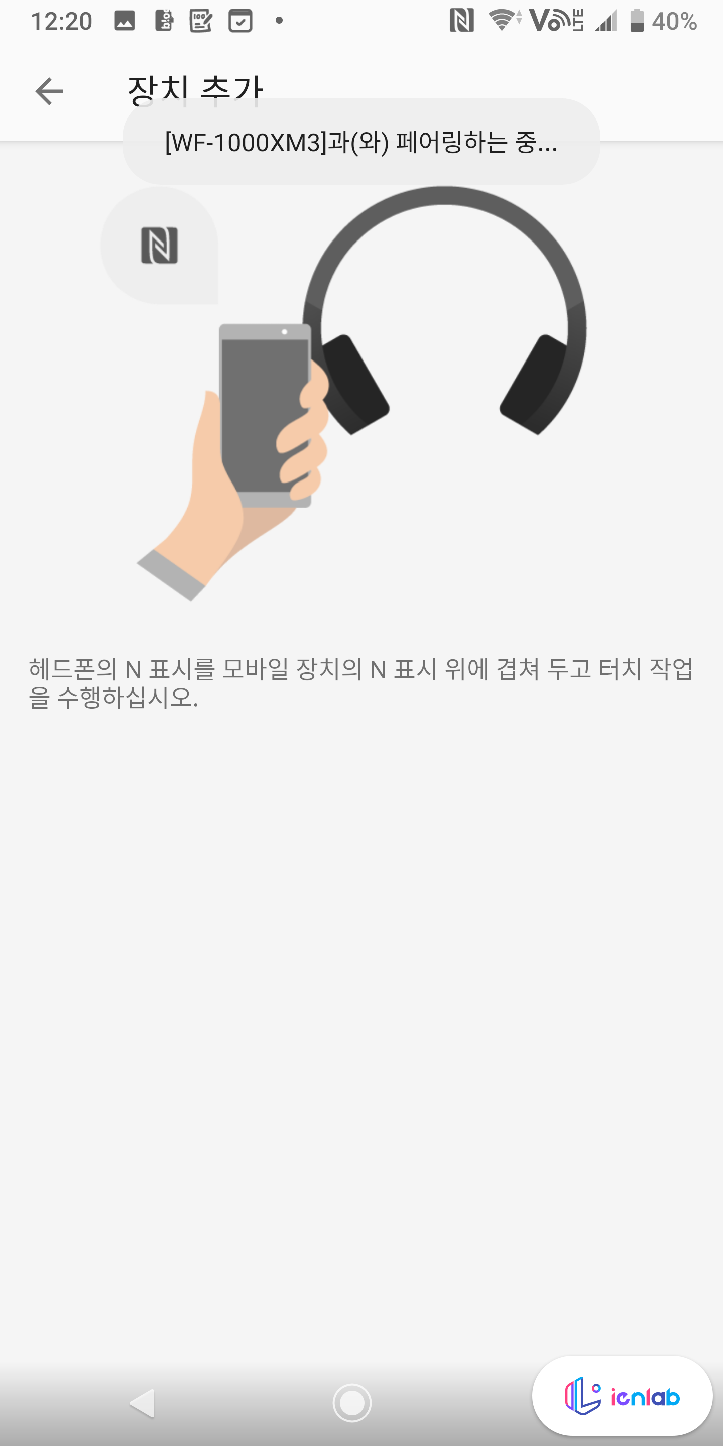 WF-1000XM3는 NFC를 통한 원터치 연결이 가능합니다. 이어폰을 귀에 장착하고, 이어폰 케이스에 있는 N 로고 표시를 스마트폰의 NFC 부위와 겹쳐서 연결을 합니다. 그러면 이어폰에서 페어링 요청을 하면서 휴대폰과 이어폰을 페어링할 수 있게 됩니다. 참 신기한 게, 이어폰 크래들에 통신 기능이 있는 건지 케이스에 NFC를 대는데도 이어폰 연결이 되네요.