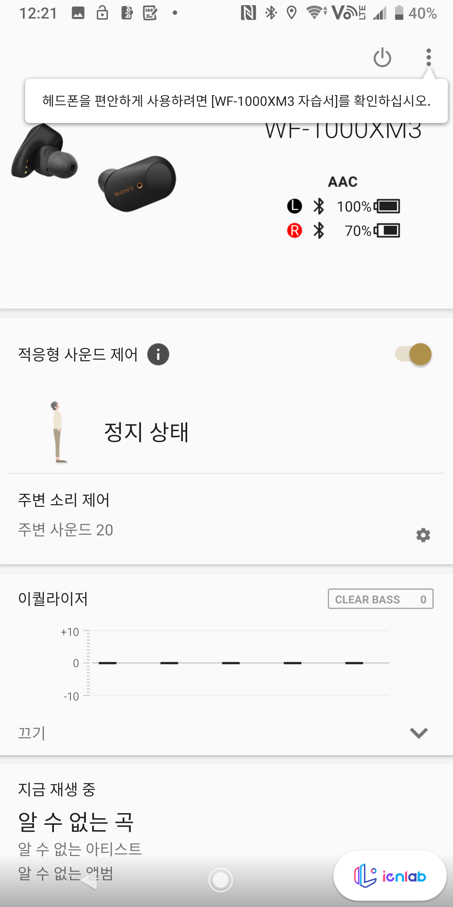 처음 와 있을 때는 왼쪽은 완전 충전되어 있었는데 오른쪽은 70퍼센트였습니다. 이상하긴 했지만 어쨌든 여러 설정을 할 수 있었는데요, 적응형 사운드 / 노이즈 캔슬링 설정, 이어폰 이퀄라이저 설정, 현재 재생중인 곡 정보와 DSEE HX (레졸루션 오디오 사운드에 가깝게 재생), 왼쪽과 오른쪽 버튼의 기능 변경, 자동 전원 끄기 정책, 알림 및 음성 언어와 소프트웨어 자동 다운로드 여부 설정이 있습니다.