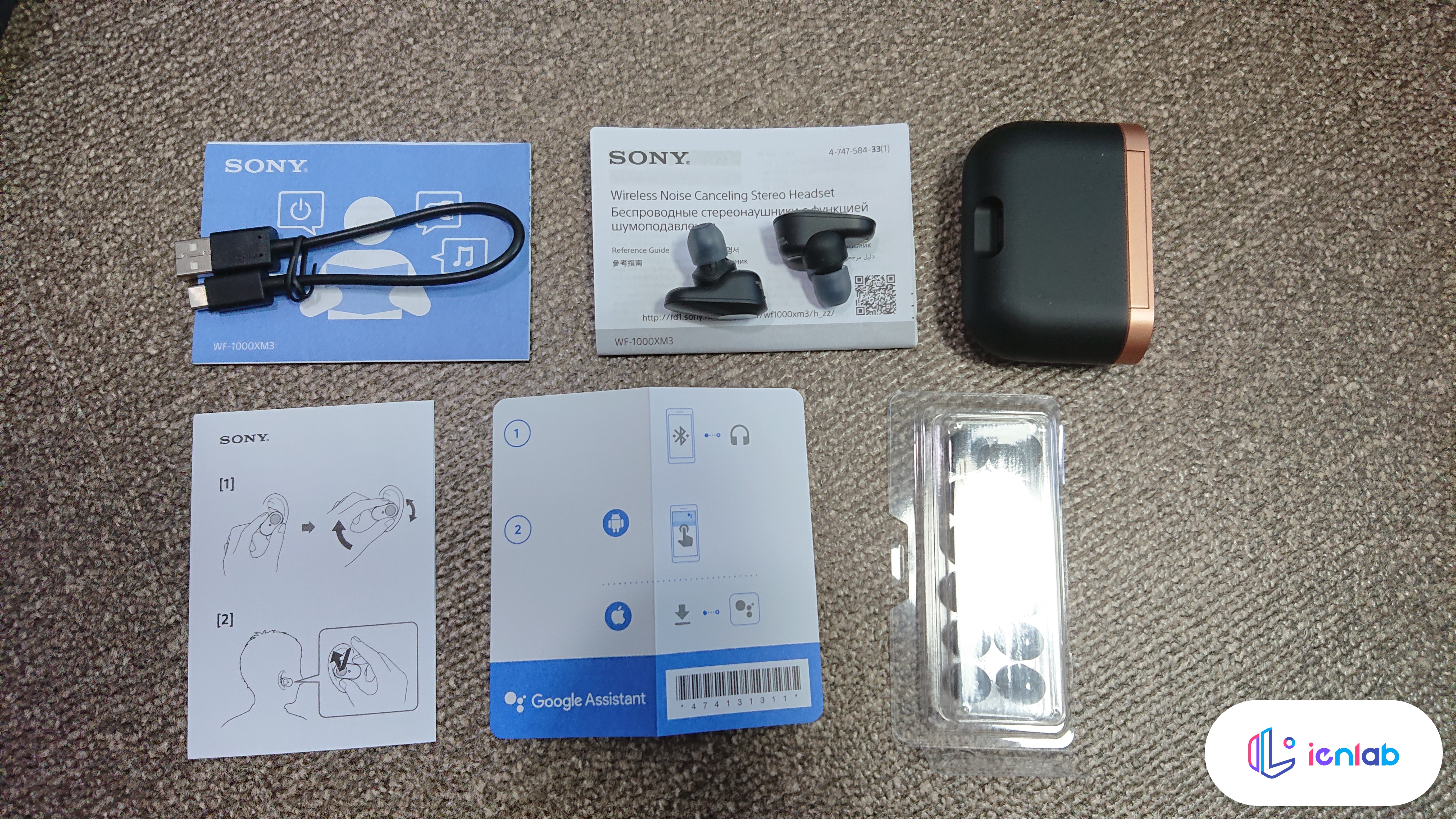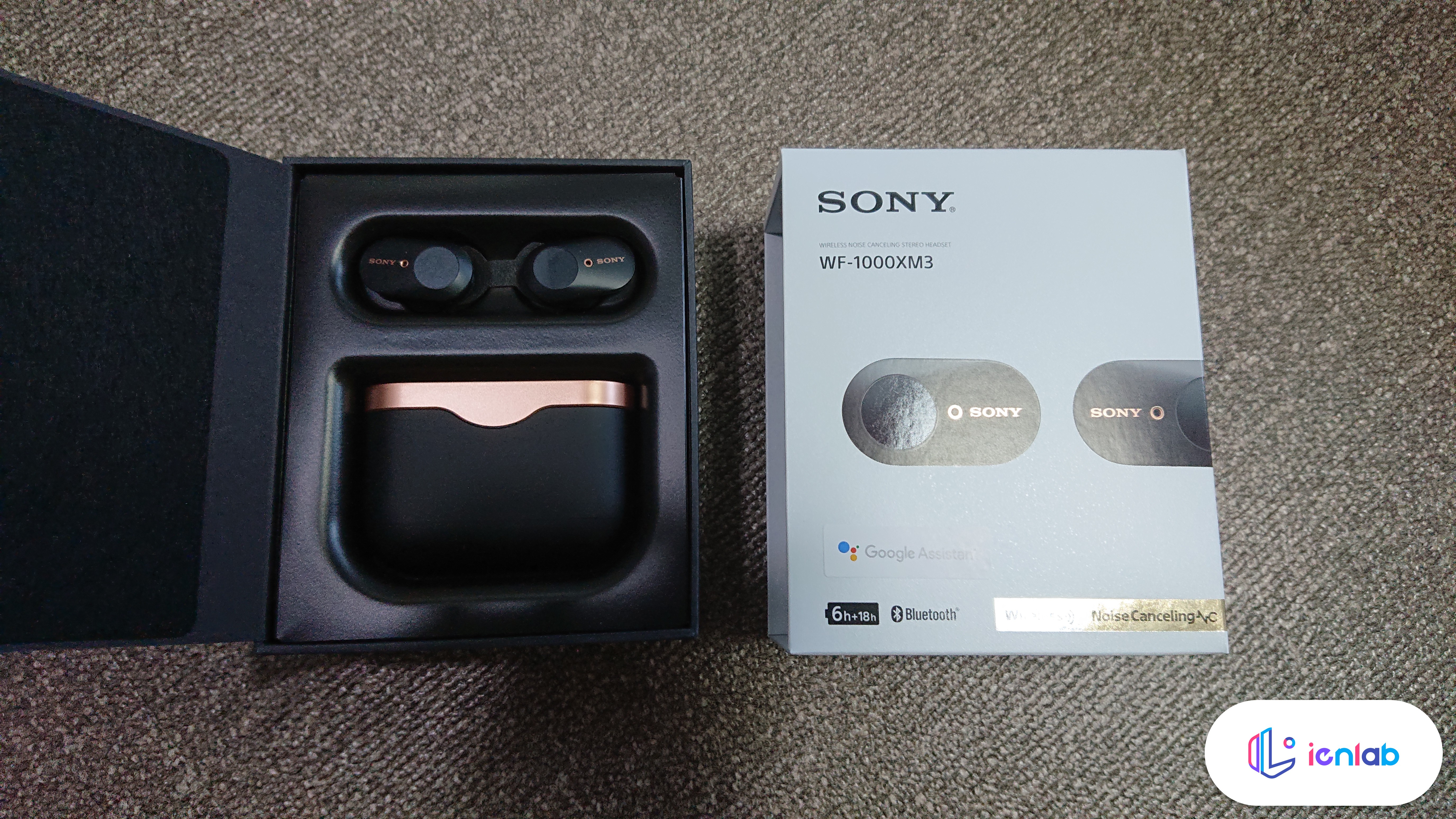 되게 신경써서 찍은 사진입니다(....). 검은색 모델을 주문했는데요, 구글 어시스턴트가 된다는 스티커가 붙어 있습니다. 깔끔한 패키징 디자인은 아니지만 소니스럽네요. 정품인증 스티커는 꼭 따로 떼서 내부에 있는 설명서에 붙여 두세요.