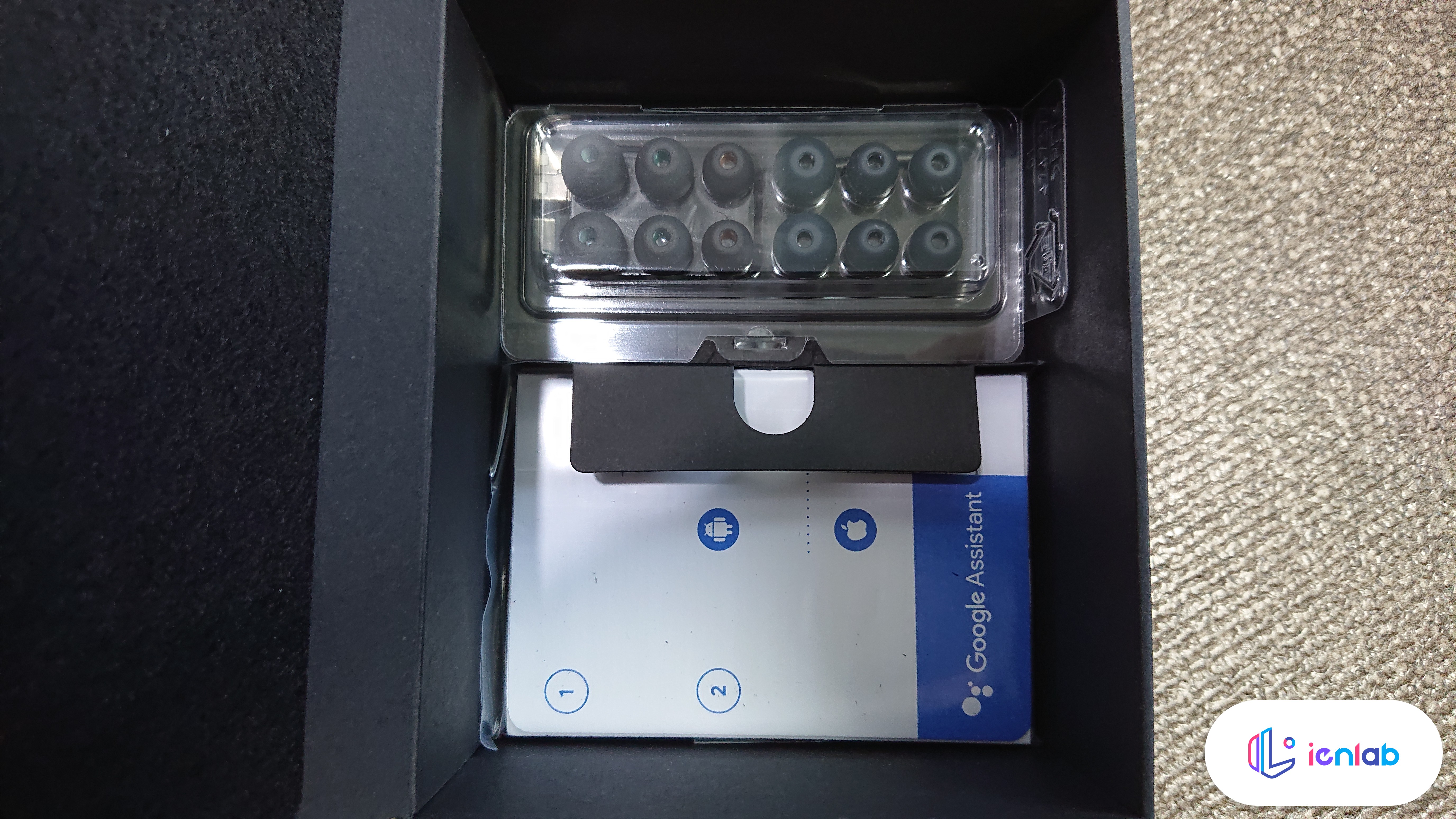 모든 구성품입니다. USB Type-C 케이블이 있고, 설명서류의 종이 4개, 폼팁 6쌍과 본체입니다. 뭐 있을 건 다 들어 있습니다. 이 제품은 Google 어시스턴트를 공식 지원해서 연결하는 방법이 나와 있습니다.