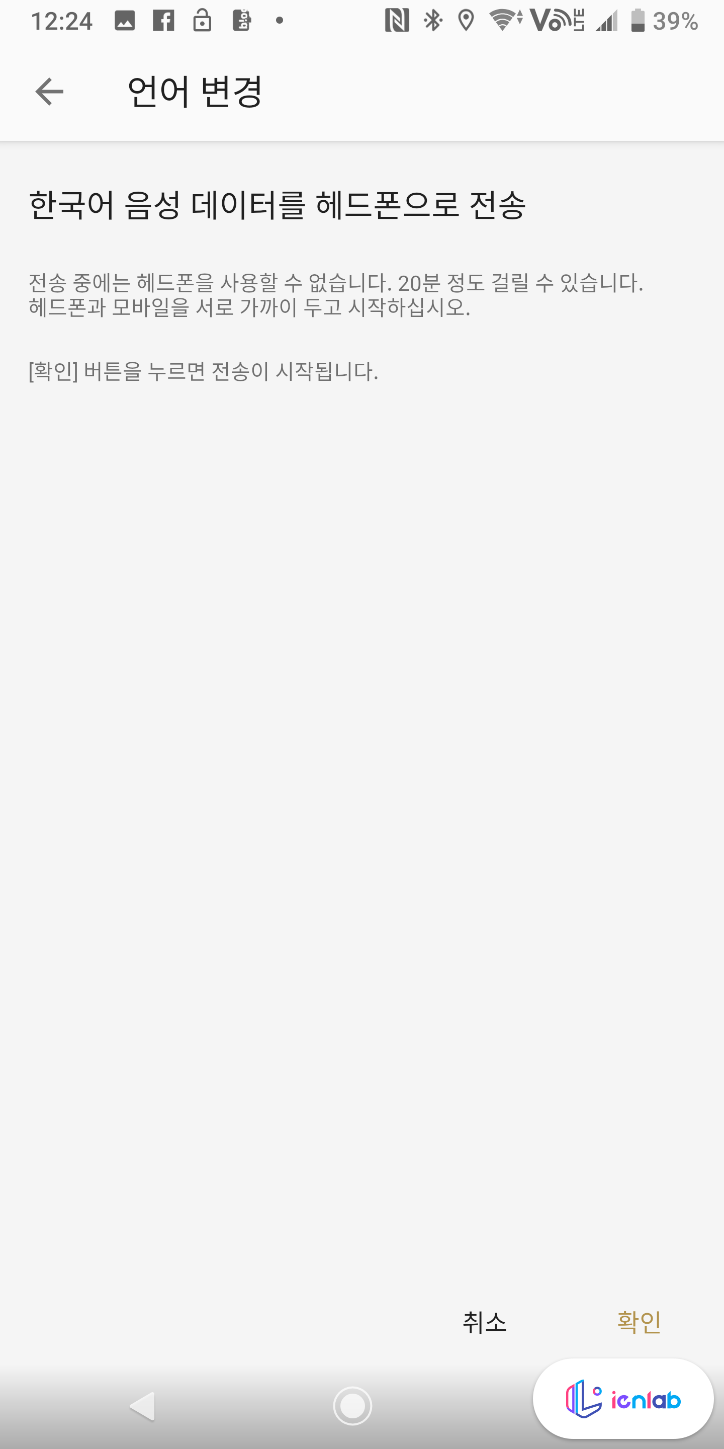 이어폰에서 나오는 음성 안내 언어를 바꿀 수 있습니다. 기본값은 영어인데요, 배터리가 70-80 정도는 되어야 이어폰으로 음성 데이터 전송이 됩니다. 20분 정도 걸린다고 했는데 그렇지는 않고요, 생각보다 한국어 안내 멘트가 상당히 딱딱합니다. 가령 예를 들면, "배터리 완전 충전됨", "블루투스 연결됨"와 같이 음슴체를 쓰더라고요. 배터리가 완전히 충전되었습니다, 또는 블루투스가 연결되었습니다와 같이 조금 부드럽게 말해 주면 좋았을 듯.