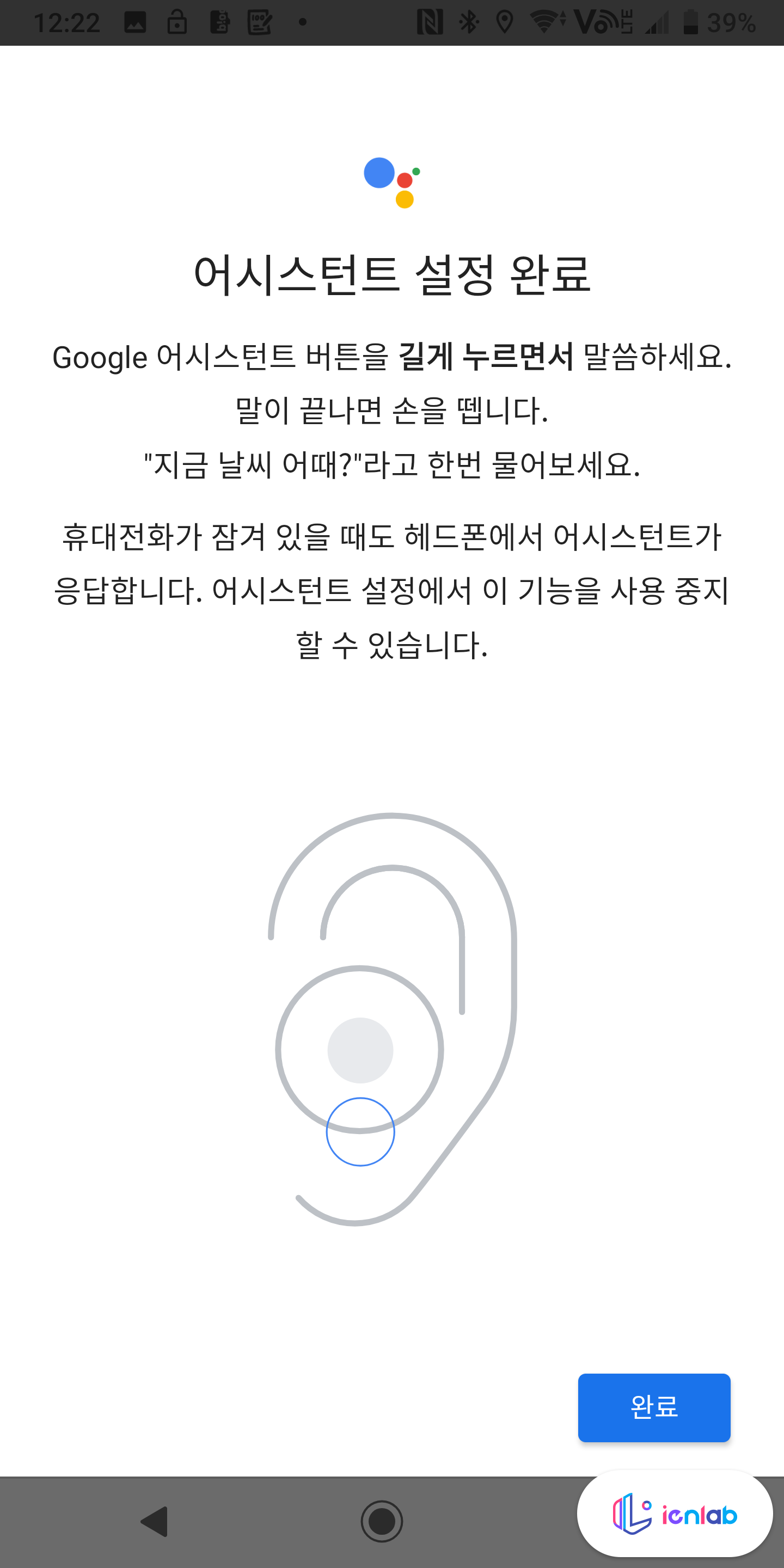 저는 구글 어시스턴트를 잘 사용중인 사용자 중에 한 명입니다. 그런데 이어폰에서 정식으로 Google 어시스턴트를 지원한다니. 물론 공식 지원한다는 표시가 없는 이어폰도 두세 번 두드리면 Siri 및 Google 어시스턴트 소환이 가능합니다. 저도 그 정도 수준이라고 생각했는데 기대 이상이었습니다. Google 어시스턴트로 설정하면 Google 앱에서 "이 기기에서 Google 어시스턴트 설정을 완료하세요"라고 뜨고 클릭을 하면 이런 게 뜬답니다.