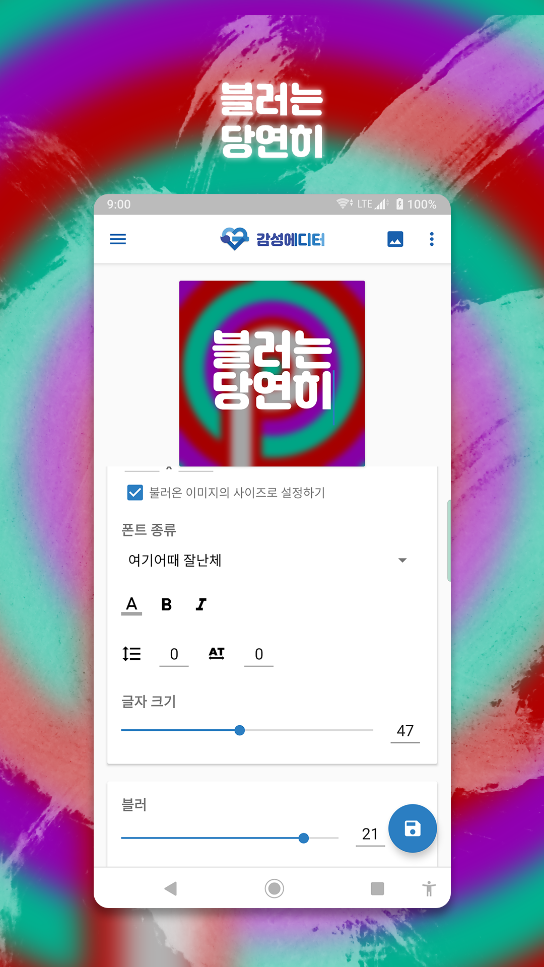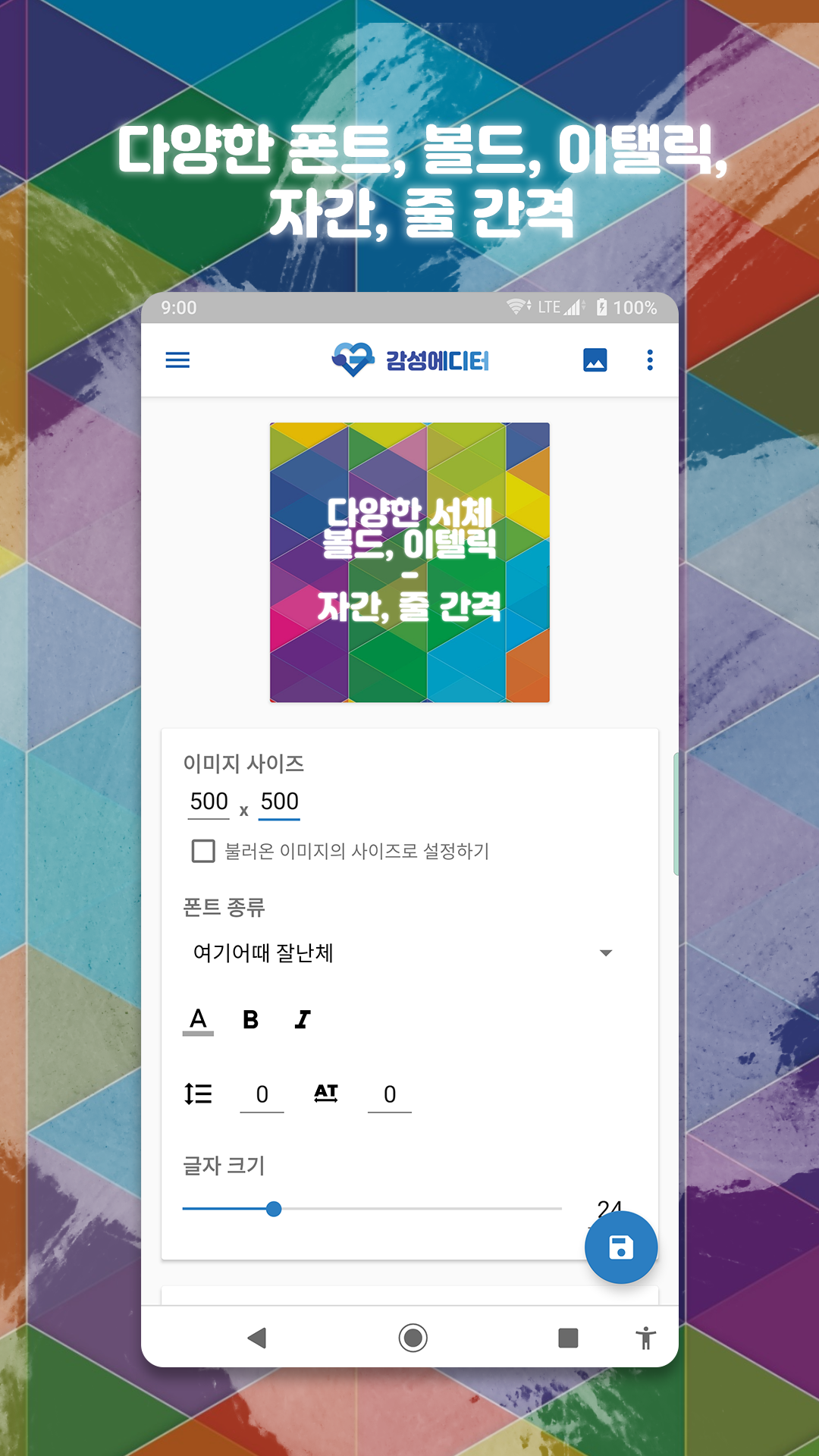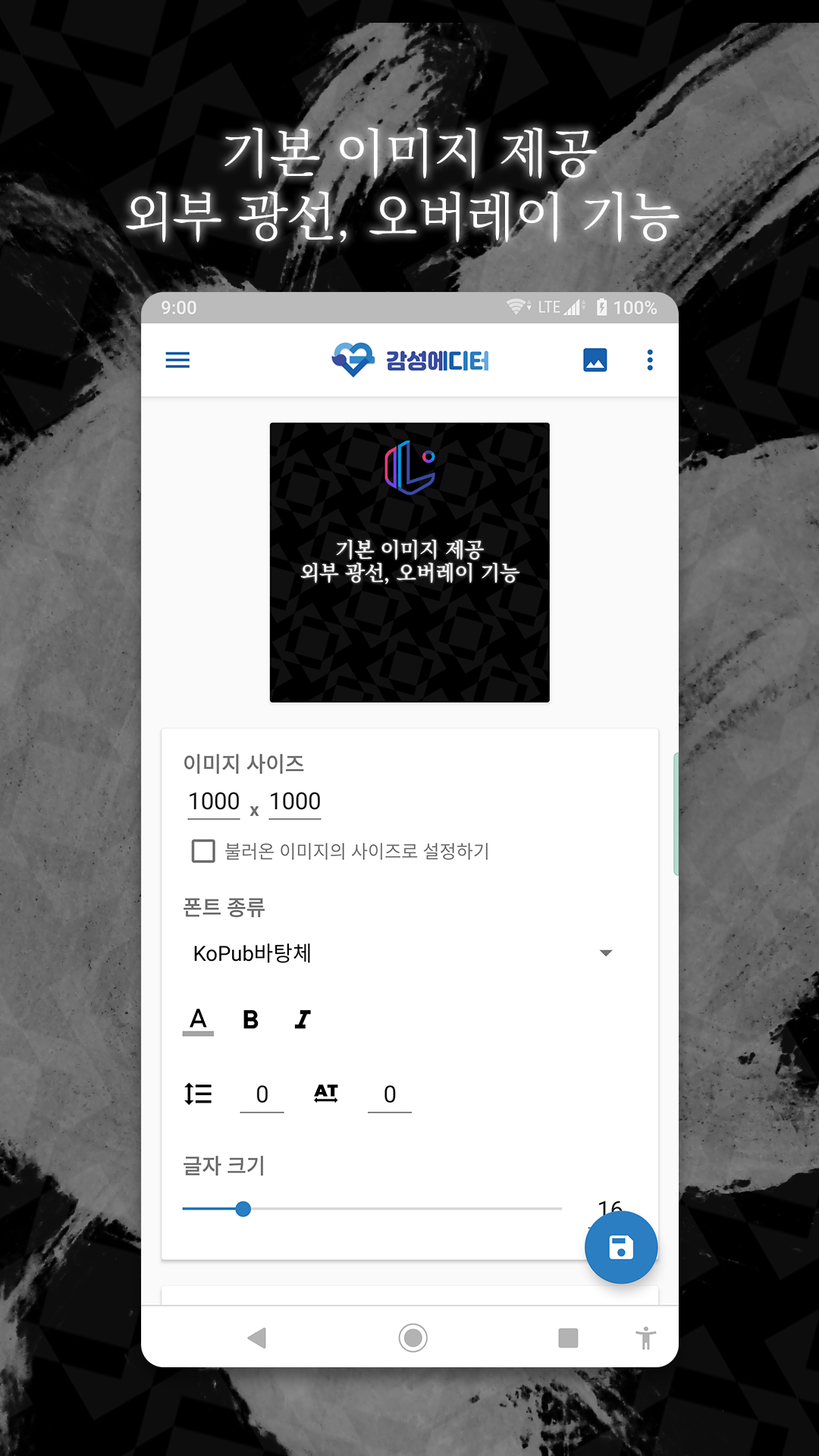 다양한 폰트 (13종의 폰트)나 심지어 사용자의 폰트를 불러와서도 사진 위에 글씨를 쓸 수 있으며, 글씨는 글씨 색이나 글씨 주변의 네온 효과 (외부 광선)을 색깔까지 선택하여 효과를 줄 수 있습니다. 사진을 다양한 크기나 비율로 수정할 수도 있고 그 이미지를 왜곡하지 않고 그 크기 그대로 글자만 올릴 수도 있습니다 (1.4.0 신기능). 이미지를 블러 처리 할 수 있습니다.