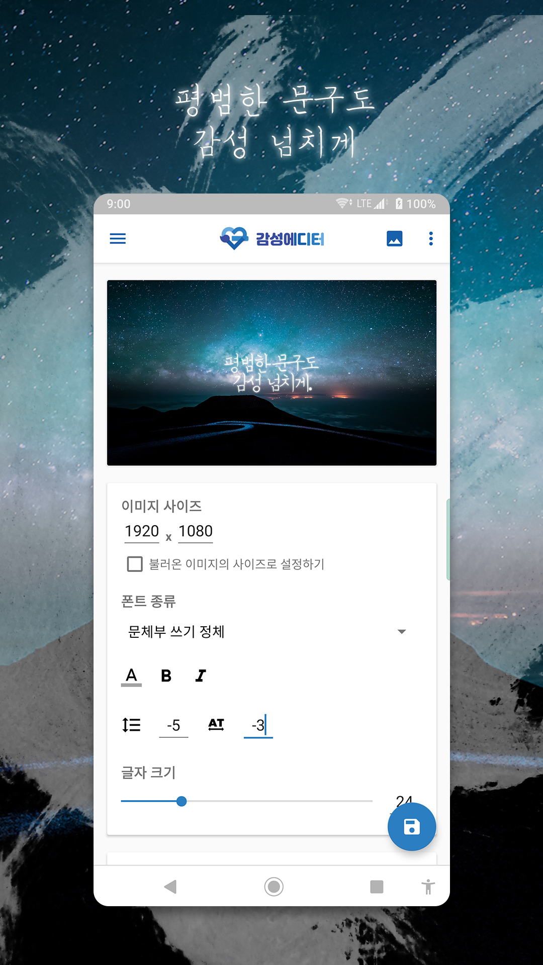 감성에디터는 Facebook 등 SNS에 감성 글을 올리는 것을 보며, '흰 배경에 기본 글자'로 감성 글이 올라가니 밋밋하고 감성이 떨어지는데, 누군가 사진에 감성적인 글씨를 같은 글귀로 쓰는데 그걸 보고 오글거리면서도 멋있다는 느낌을 받게 되었습니다. 그렇다면 이런 것을 쉽게 만들어 SNS에 공유하면 좋지 않을까? 라는 생각에서 출발한 어플리케이션입니다. 사진을 불러오고, 글씨를 쓰고 부가로 글씨를 장식까지 하면 끝입니다.